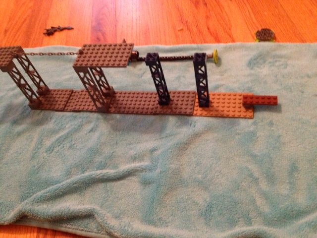 My oldest son, 9 years old, codename Red, was watching Wipe-Out on TV. He decided that he wanted to use Legos to build his own Wipe-Out obstacle course. That is totally fine. He told me he wanted to put the Legos over/in real water because that’s how the show does it. That is not fine. Firstly, Legos + sink/tub with drain = lost Legos. And secondly, we live in a rental house with real hardwood floors. I’m not letting him randomly play with a bowl full of water.